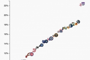 本賽季各球隊(duì)中投(10英尺-三分線之間)占比如圖所示,擁有德羅贊的國王和杜蘭特的火箭占比超過22%,聯(lián)盟獨(dú)一檔,公牛則不到7%聯(lián)盟最低,也算獨(dú)一檔。