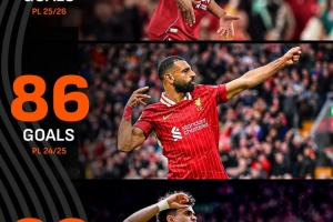 過去兩個賽季,利物浦38輪聯(lián)賽均打進86球。也就是說,剩余的7場聯(lián)賽,即便紅軍每場比賽打進5球也無法和過去兩個賽季的進球數(shù)匹敵。