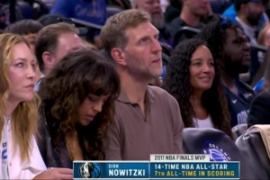 鏡頭捕捉到,獨(dú)行俠名宿諾維茨基來到現(xiàn)場(chǎng)觀看比賽。