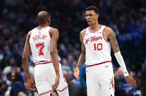 首節(jié)比賽,火箭進攻端靠杜蘭特和小賈巴里·史密斯撐起來,二人內(nèi)外線都很高效,其中杜蘭特7中5(三分2中2)拿到12分1籃板1蓋帽;小賈巴里·史密斯4中4(三分2中2)拿到10分1籃板1助攻。