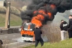 一輛載有球迷的大巴在英國一條繁忙的高速公路上起火燃燒,給前往觀看聯(lián)賽杯決賽的球迷造成交通混亂。這輛起火的大巴停在西米德蘭茲郡M6高速公路3號(hào)交匯處附近,據(jù)信車上載有曼城球迷。