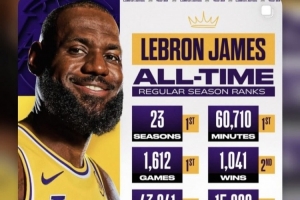 詹姆斯轉(zhuǎn)發(fā)了NBA官方賬號(hào)發(fā)布的他生涯各項(xiàng)數(shù)據(jù)紀(jì)錄的歷史排名,并評(píng)論道:“無(wú)比幸福!??!?????”