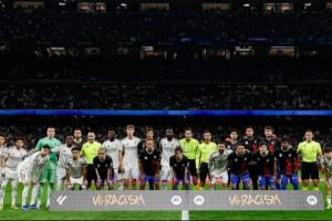 皇馬官推曬出賽前反種族歧視活動的合影,并配文:“團結(jié)起來反對種族歧視?!?/p>