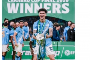 曼城官方社媒曬出奧賴?yán)醣恼掌?,配文:“周六慶祝自己的21歲生日,周日為兒時的俱樂部將溫布利染成藍(lán)色,奧賴?yán)耐昝乐苣??!?/p>