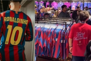 在周日對(duì)陣賽前,巴薩球員全員身著印有羅納爾迪尼奧10號(hào)的2005/06賽季巴黎歐冠決賽版球衣亮相,這一致敬經(jīng)典的舉動(dòng)迅速點(diǎn)燃了球迷的購(gòu)買(mǎi)欲。