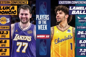 體育資訊3月24日訊 今日NBA官方宣布,湖人球星東契奇和黃蜂球星拉梅洛·鮑爾分別被評為本賽季第22周西部和東部聯(lián)盟周最佳球員。