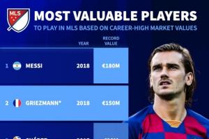 據(jù)德轉(zhuǎn)統(tǒng)計(jì),格列茲曼成為巔峰身價(jià)第二高的美職聯(lián)球星,他的巔峰身價(jià)是2018年時(shí)的1.5億歐,僅次于梅西的1.8億歐。