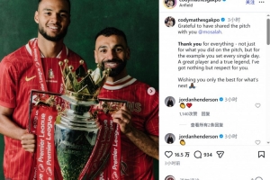 加克波社媒曬出與薩拉赫的合照,配文:“很榮幸能與你并肩作戰(zhàn)。