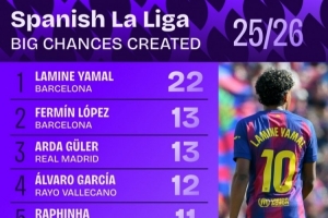體育資訊3月26日訊 Squawka統(tǒng)計(jì)了本賽季西甲創(chuàng)造機(jī)會(huì)次數(shù)最多的球員,亞馬爾以22次領(lǐng)銜。