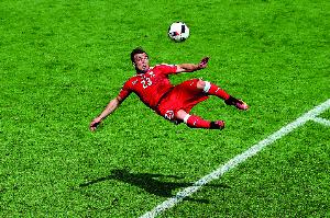這“特別的事”便是一記精彩絕倫的倒掛金鉤——他用左腳完美地迎球抽射,皮球直掛球門死角,彈地后越過波蘭門將法比安斯基的指尖,應(yīng)聲入網(wǎng)。