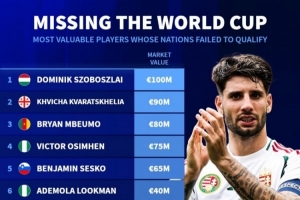 無(wú)緣今年世界杯球員身價(jià)排名(所在球隊(duì)未晉級(jí),不包含附加賽球隊(duì)):