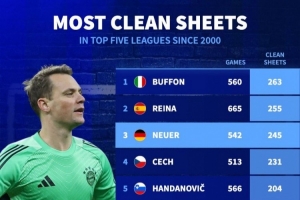 體育資訊3月27日訊 德國轉(zhuǎn)會市場統(tǒng)計了2000年以來五大聯(lián)賽門將零封場次,并列出榜單,布馮263場居首,雷納、諾伊爾排名二三位。