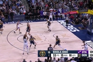 比賽進(jìn)行到關(guān)鍵時(shí)刻,掘金球星約基奇助攻卡梅隆·約翰遜命中底角三分球終于追平比分,同時(shí)自己的數(shù)據(jù)來到33分15籃板10助攻的三雙。