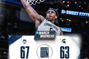 體育資訊3月28日訊 NCAA瘋?cè)?6進(jìn)8,康涅狄格大學(xué)67-63險(xiǎn)勝密歇根州立大學(xué),晉級16強(qiáng)。