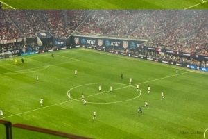 美國隊(duì)在梅賽德斯-奔馳體育場(chǎng)進(jìn)行本場(chǎng)比賽時(shí),身著為今年夏天世界杯發(fā)布的新款球衣。這款球衣采用了美國國旗的色調(diào),球衣上印有波浪狀的紅色和白色條紋,球衣背面則有大面積的白色區(qū)域。