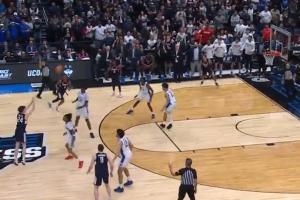 末節(jié)最后10秒(杜克72-70康大),杜克后場發(fā)球。球隊后衛(wèi)凱登·布澤爾接球轉(zhuǎn)身后面對康大雙人包夾,躍起欲傳球被攔下,發(fā)生致命失誤。