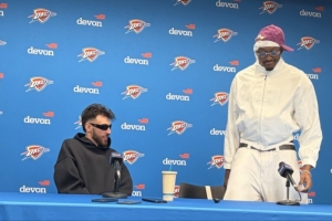 賽后,雷霆球員杰倫·威廉姆斯和霍姆格倫出席了新聞發(fā)布會。兩人著裝配色完全相反,杰倫威調侃道:“全黑和全白,就像陰和陽。”