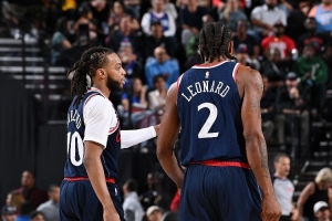 記者提到當加蘭和倫納德同時在場時,球隊84%的出手都集中在籃下或者三分線外,對此可以說:“我非常喜歡這個組合,加蘭能能夠打擋拆,突破到內(nèi)線并做出正確的選擇,科懷(倫納德)一旦上場就能吸引大量的防守注意力?!?/p>