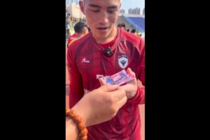 體育資訊4月1日訊 4月1日,2026泰山好水CMG群眾足球邀請(qǐng)賽小組最后一個(gè)比賽日,山東泰安隊(duì)2-2戰(zhàn)平青海玉樹隊(duì),記者牛志明賽后向玉樹隊(duì)門將索南龍周贈(zèng)送王大雷簽名照。