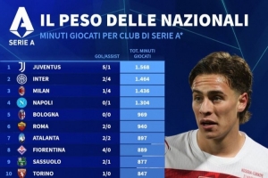 體育資訊4月2日訊 德國轉(zhuǎn)會市場統(tǒng)計了意甲各隊球員在這個國際比賽日的出場總時間,并列出榜單,尤文、國米、米蘭前三。