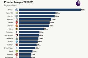 切爾西在本賽季支付了6510萬英鎊的經(jīng)紀人費用,連續(xù)第三個賽季領(lǐng)跑俱樂部榜單。2025-26賽季,切爾西占到了英格蘭足球聯(lián)賽92家俱樂部經(jīng)紀人總支出的12%。