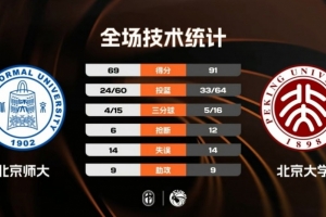 末節(jié)比賽,北京師大率先發(fā)力將分差追到個(gè)位數(shù),但這個(gè)勢(shì)頭并沒(méi)有延續(xù)太長(zhǎng)時(shí)間,及時(shí)調(diào)整的北京大學(xué)此后打出一波小高潮穩(wěn)住局勢(shì),他們?cè)诠?jié)末轟出一波流帶走比賽,最終北京大學(xué)大勝北京師大繼續(xù)保持不敗。