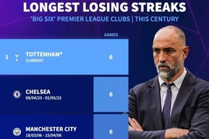 據(jù)德轉(zhuǎn)數(shù)據(jù)統(tǒng)計(jì),6連敗是本世紀(jì)英超Big6球隊(duì)遭遇的最長連敗,如果在當(dāng)?shù)貢r(shí)間本周日的聯(lián)賽中不敵利物浦,熱刺將成為本世紀(jì)Big6球隊(duì)中連敗場次最多的球隊(duì)。