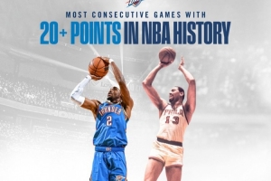 這樣,亞歷山大連續(xù)127場(chǎng)至少20分,正式超越1961-63賽季的張伯倫(126場(chǎng)),登頂NBA歷史第一。