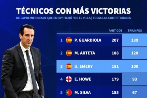 埃梅里2022年11月執(zhí)教維拉以來英超主帥勝場排名(所有賽事):