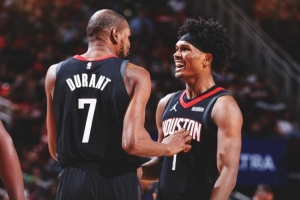 賽后火箭官方發(fā)布贏球海報(bào),杜蘭特和阿門·湯普森成為封面人物。