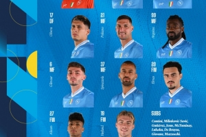那不勒斯首發(fā):1-梅雷特;31-別克馬、4-布翁喬爾諾、17-奧利維拉;21-波利塔諾、99-安古伊薩、6-吉爾莫、37-斯皮納佐拉、20-埃爾馬斯;27-阿利松·桑托斯、19-霍伊倫