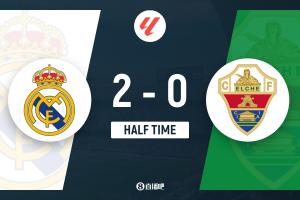 體育資訊3月15日訊 北京時(shí)間3月15日凌晨4時(shí),西甲第28輪,皇馬坐鎮(zhèn)伯納烏球場(chǎng)迎戰(zhàn)埃爾切。上半場(chǎng),巴爾韋德任意球造險(xiǎn),呂迪格破門首開紀(jì)錄,隨后巴爾韋德擴(kuò)大領(lǐng)先優(yōu)勢(shì)。半場(chǎng)戰(zhàn)罷,皇馬暫2-0埃爾切。