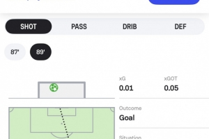 數(shù)據(jù)網(wǎng)站Sofascore曬出居萊爾射門路線圖,并調(diào)侃道:“我們可能需要重新設(shè)計球員的射門路線圖了,因?yàn)榘雸鰣D已經(jīng)放不下這腳吊射了?!?/p>