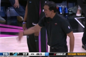 這球怎么看?熱火落后4分拉松發(fā)球被吹5秒違例 斯波場(chǎng)邊直接氣炸