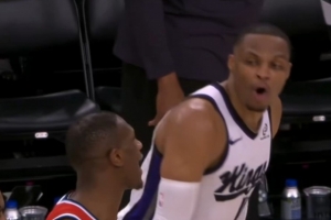 比賽最后時(shí)刻,威少與快船后衛(wèi)克里斯·鄧恩爆發(fā)口角,威少怒噴道:“你TM就是個(gè)無(wú)名小卒、無(wú)名小卒。你是誰(shuí)?來(lái)試試?你根本不敢。滾回去吧(此時(shí)鄧恩被換下),你TM在說(shuō)什么?”