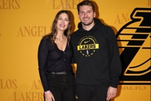 賽后,網壇名宿莎拉波娃和東契奇合影留念。