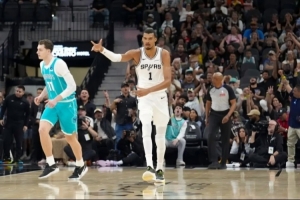 最后一節(jié)文班2封蓋,黃蜂禁區(qū)里7投2中,投了15個三分球:全場黃蜂投了54個三分球。