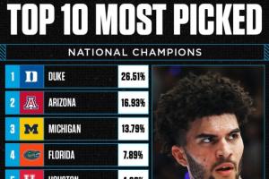 據(jù)統(tǒng)計(jì),杜克大學(xué)目前是奪冠最大熱門(mén),支持率高達(dá)26.51%位居榜首。亞利桑那大學(xué)(16.93%)和密歇根大學(xué)(13.79%)分列二三。之后是佛羅里達(dá)大學(xué)、休斯敦大學(xué)、岡薩加大學(xué)、普渡大學(xué)、康涅狄格大學(xué)、阿肯色大學(xué)和愛(ài)荷華州大。排在前四的正是四大賽區(qū)的一號(hào)種子。