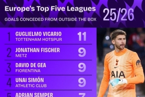 本賽季五大聯賽門將禁區(qū)外失球榜: