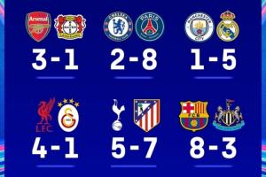 其余四支英超球隊(duì)則紛紛止步本輪,且多數(shù)遭遇大比分慘敗:曼城總比分1-5不敵皇馬,切爾西2-8被巴黎橫掃,紐卡3-8負(fù)于巴薩。熱刺雖然在本輪對(duì)決中贏下比賽挽回些許顏面,但仍以總比分5-7不敵馬競(jìng),無(wú)奈告別歐冠賽場(chǎng)。