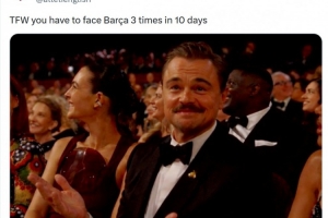 這意味著馬競將在10天內(nèi)3次對陣巴薩,馬競官方社媒曬出萊昂納多·迪卡普里奧在奧斯卡頒獎典禮上一臉無奈的照片,配文:“當(dāng)你不得不在10天內(nèi)3次對陣巴薩時的感受?!?/p>