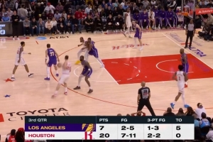 第三節(jié)前半節(jié),火箭轟出20-7的攻擊波,火箭投籃11中7(三分2中2),湖人則5中2(3中1)。湖人5失誤,火箭0次。