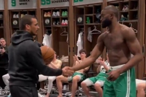 本場(chǎng)比賽杰倫·布朗砍下32分,得分升至隊(duì)史前十,賽后馬祖拉在更衣室將比賽用球交給杰倫·布朗,全隊(duì)一起祝賀他的這一里程碑。