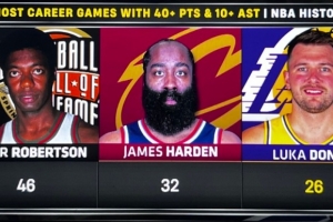 據統(tǒng)計,這是東契奇生涯第26場單場至少40分10助攻,歷史第三多,僅次于大O和哈登。