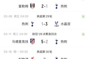 熱刺歐冠1/8決賽首回合2-5慘敗馬競,下周一周內(nèi)將連續(xù)對陣利物浦、馬競(次回合)、森林。