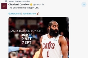 賽后騎士官方曬哈登數(shù)據(jù)海報,配文寫道:大胡子在芝加哥大顯身手。