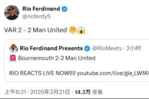 體育資訊03月21日訊 英超第31輪,10人曼聯(lián)客場(chǎng)2-2戰(zhàn)平伯恩茅斯,本場(chǎng)比賽的判罰引發(fā)爭(zhēng)議。賽后,費(fèi)迪南德憤怒發(fā)文:“VAR 2-2 曼聯(lián)????”。